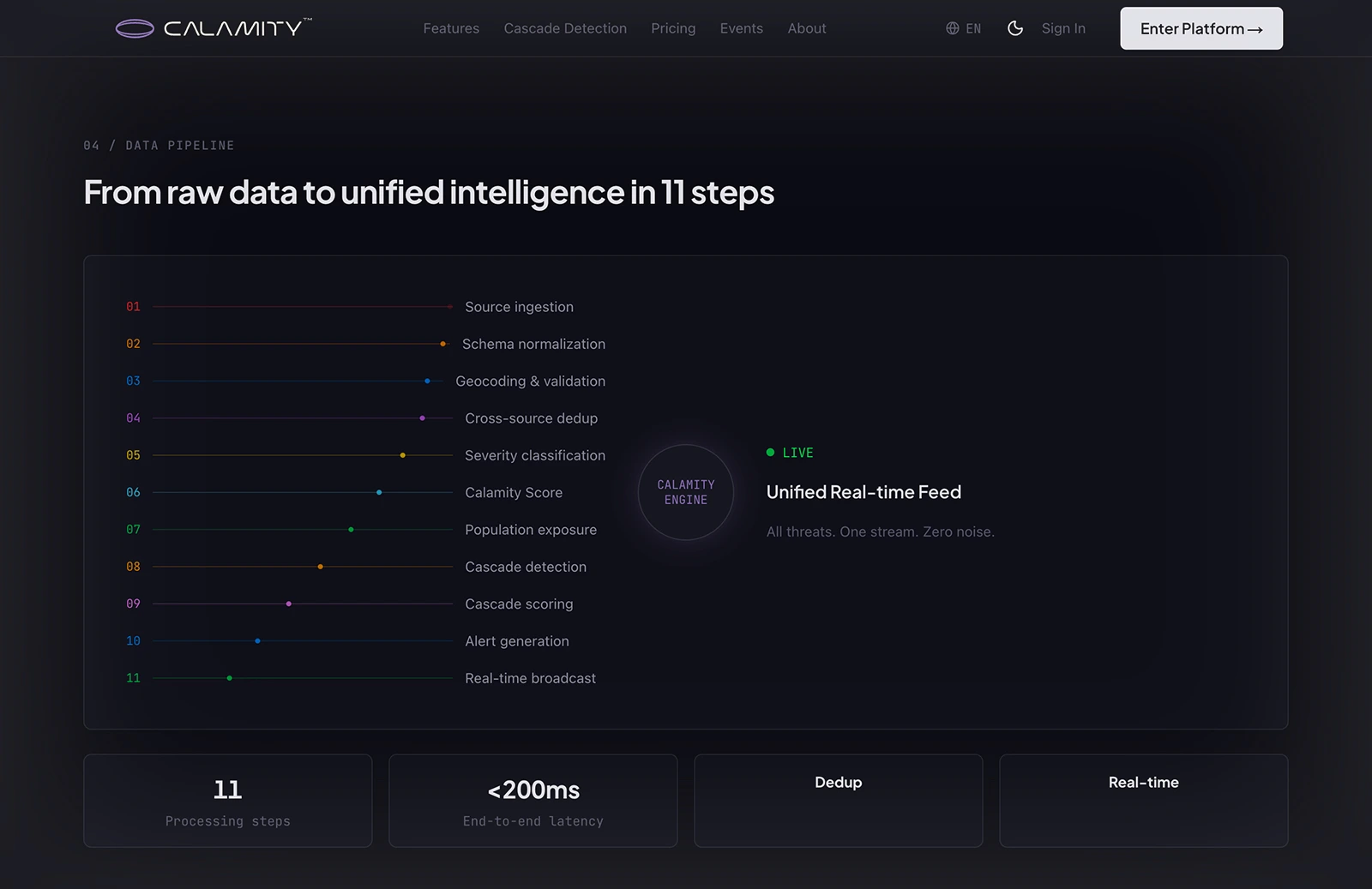 Calamity.live è una piattaforma di monitoraggio in tempo reale dei disastri naturali nel mondo. Raccoglie dati da oltre 23 enti di ricerca internazionali per offrire allerte immediate e analisi predittive a governi, ONG e aziende.