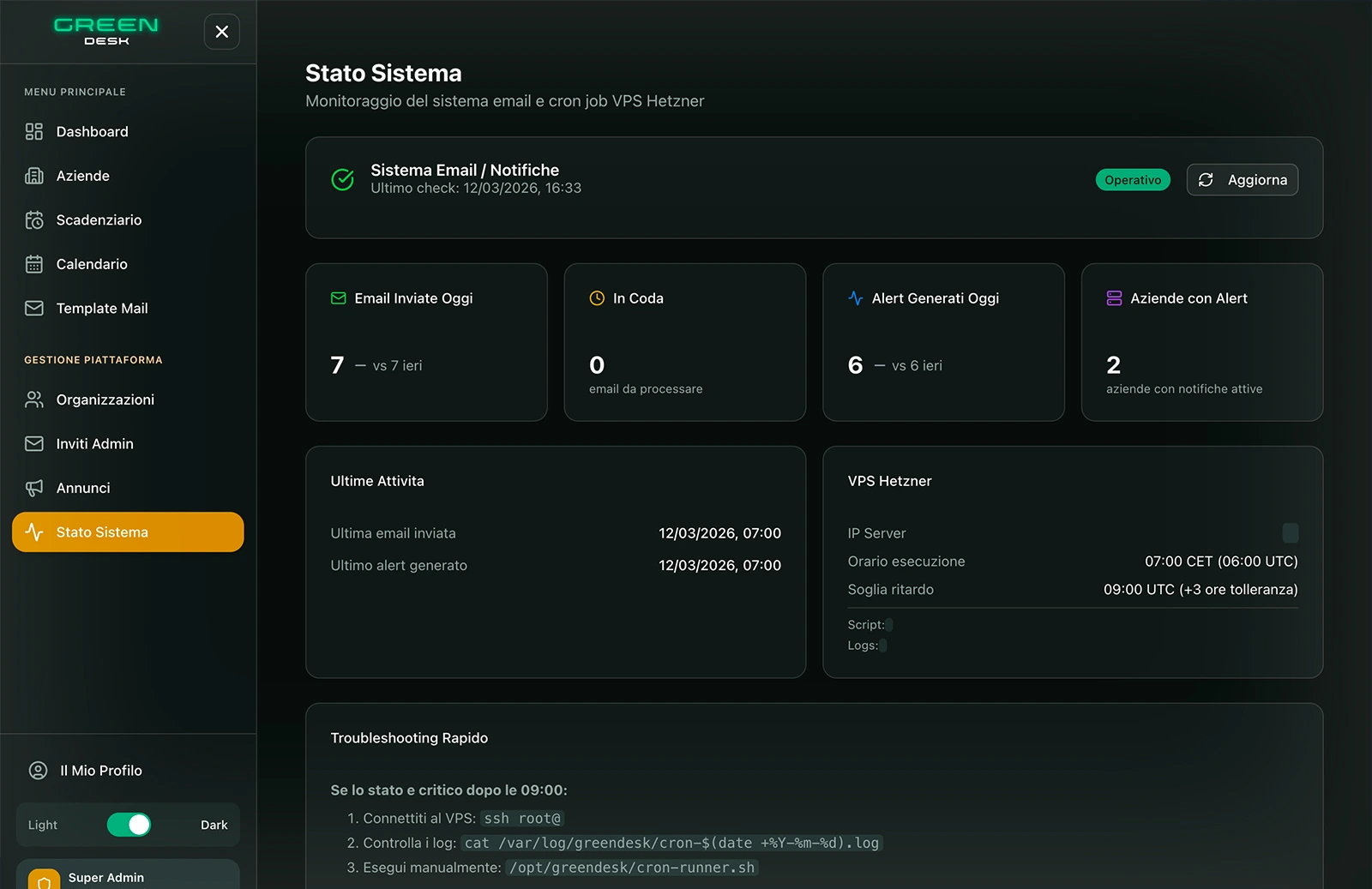 GreenDesk ©. Piattaforma gestionale nata dall'esigenza concreta di diversi studi ingegneristici ambientali. Sviluppata inizialmente come strumento interno, è cresciuta fino a diventare un ecosistema completo per la gestione di scadenziari, notifiche e flussi documentali.