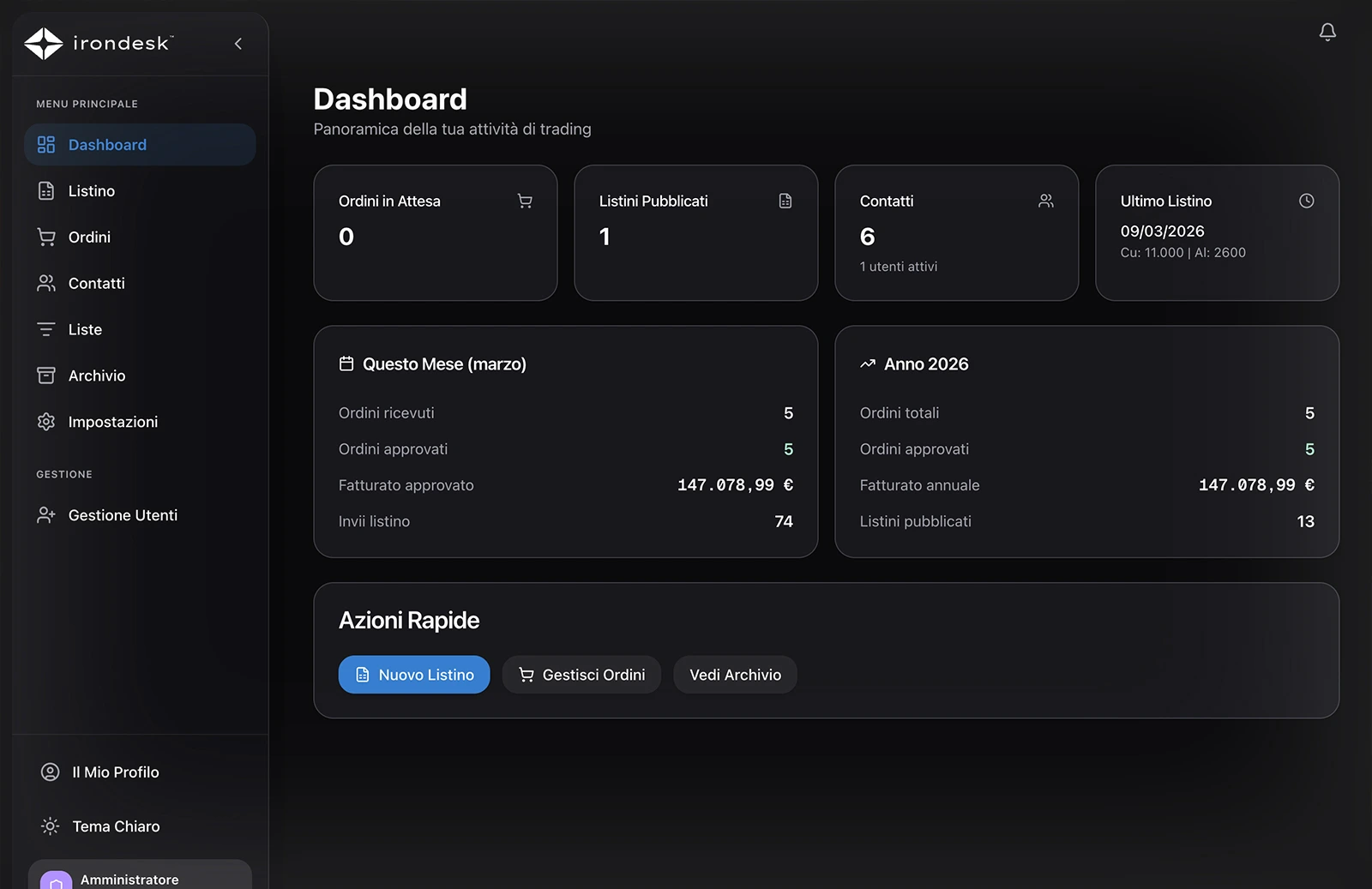 IronDesk ©. Nata dall'esigenza di top player dell'industria del riciclo e della vendita metalli, IronDesk è una piattaforma B2B costruita per gestire listini, ordini e logistica su larga scala con standard di sicurezza enterprise e architettura pensata per la crescita.